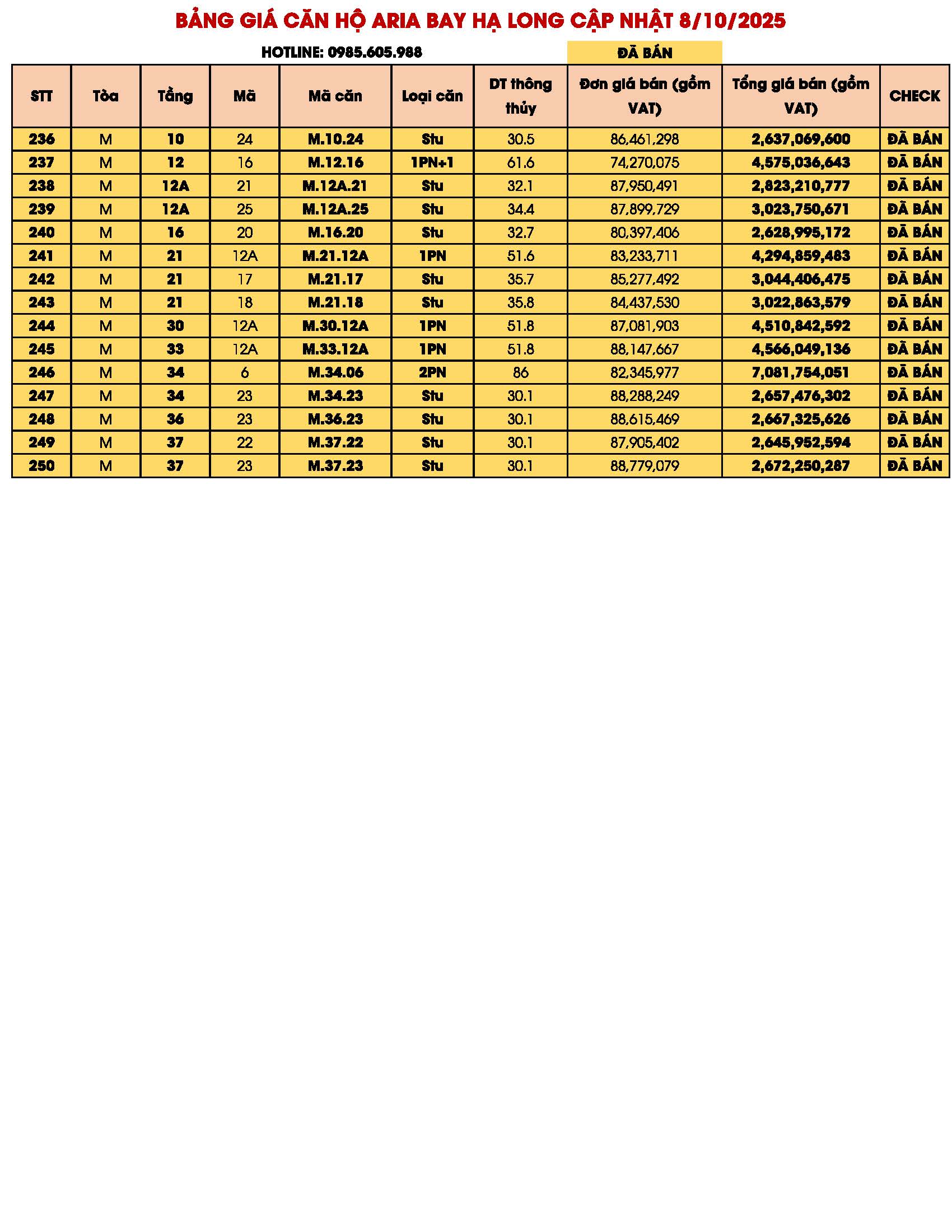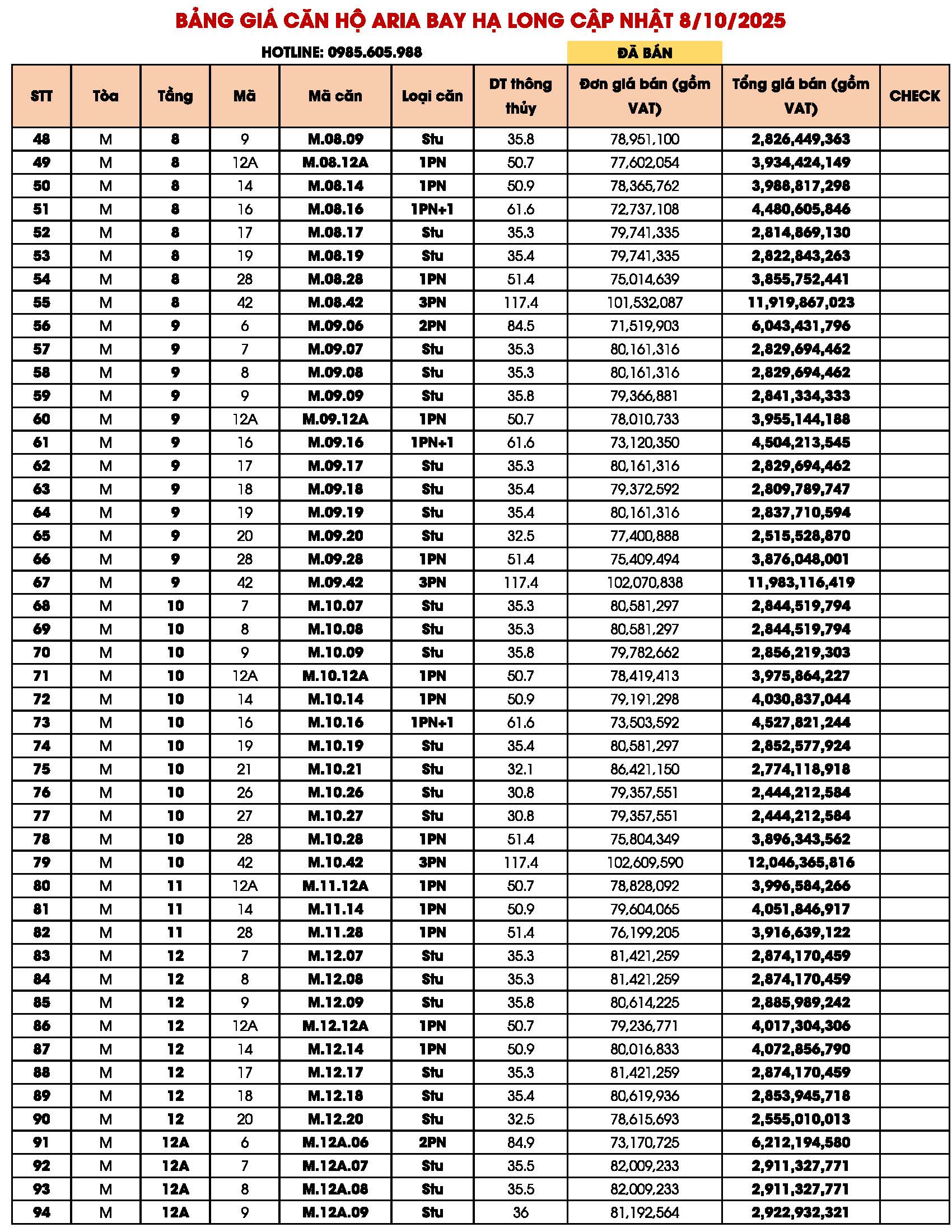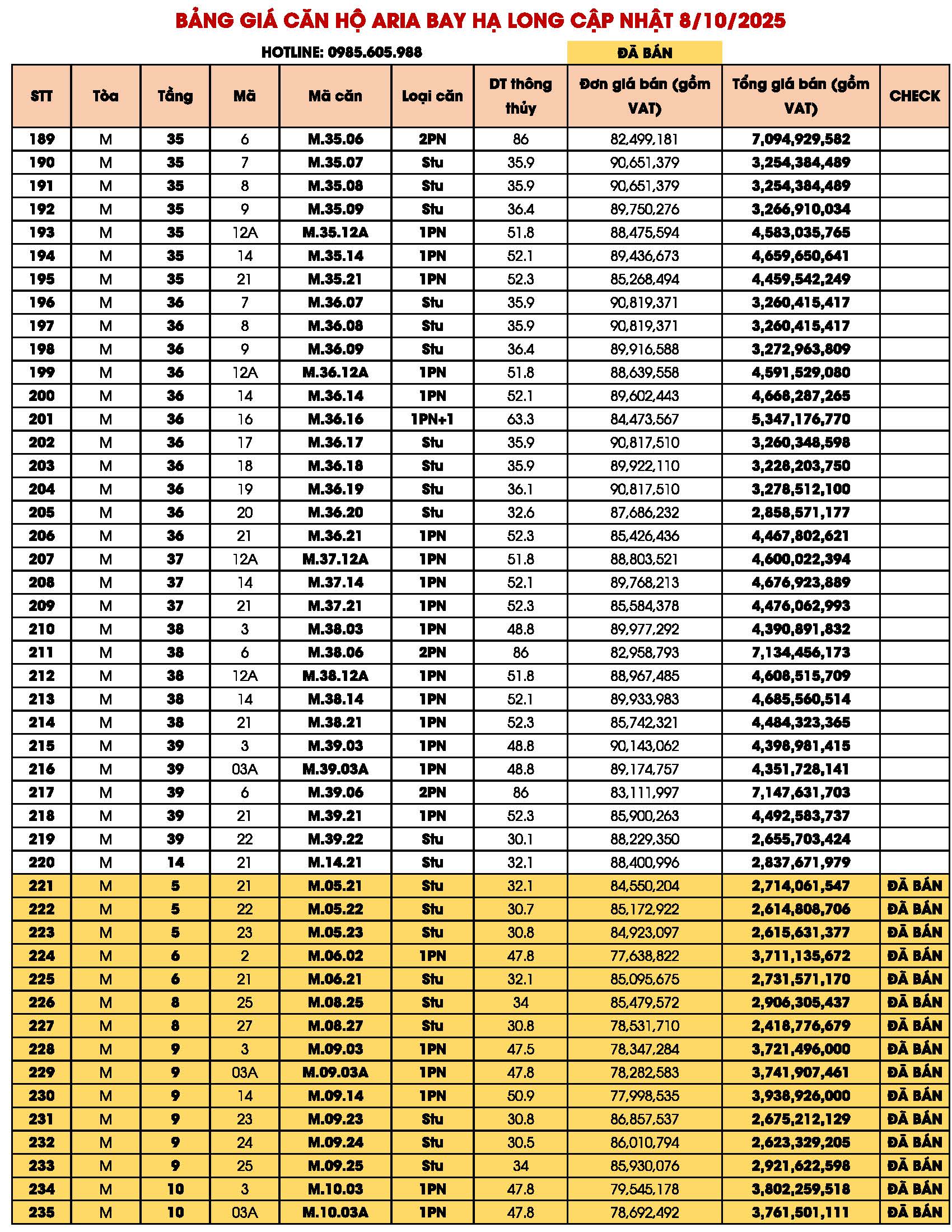 BẢNG GIÁ CĂN HỘ ARIA BAY HẠ LONG BIM GROUP NGÀY 09/10/2025