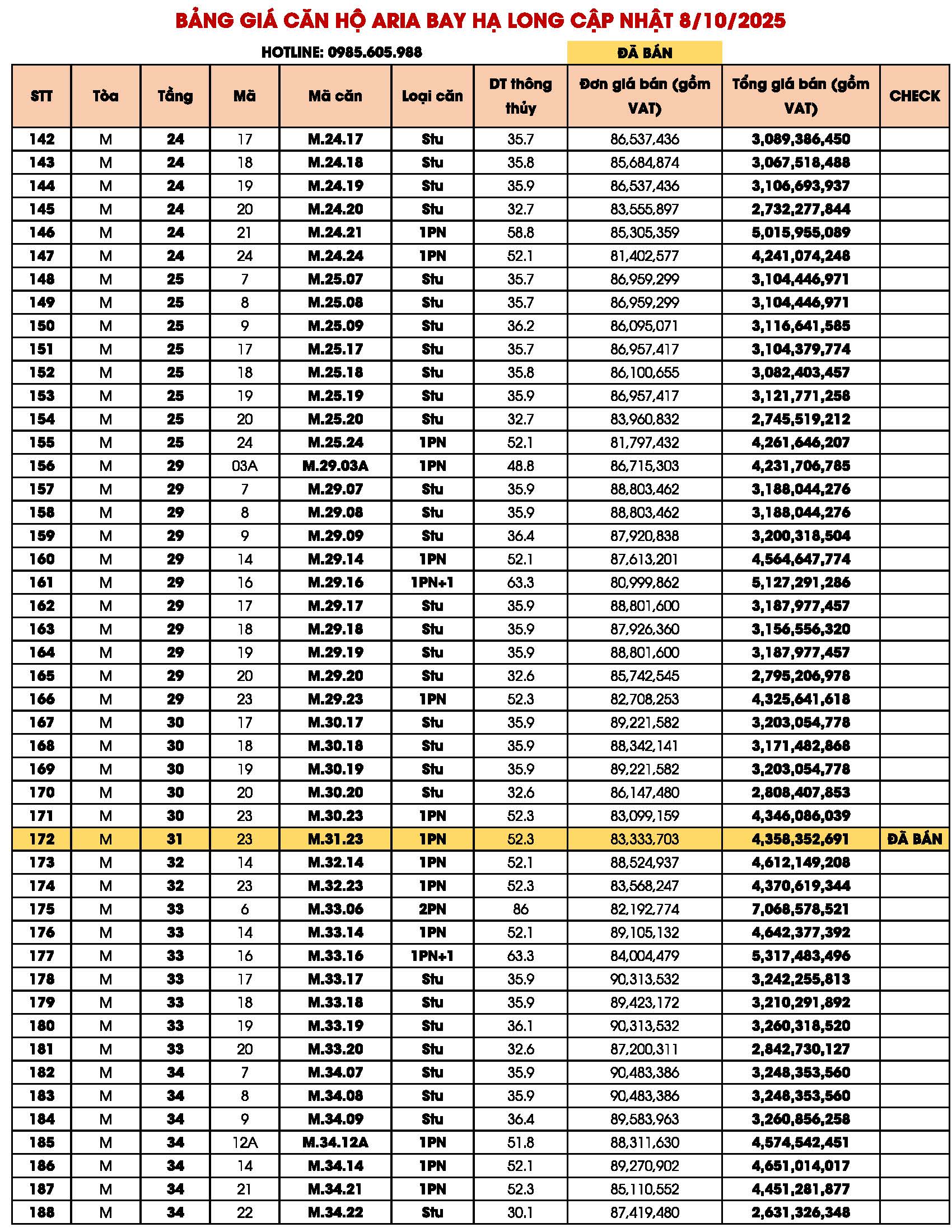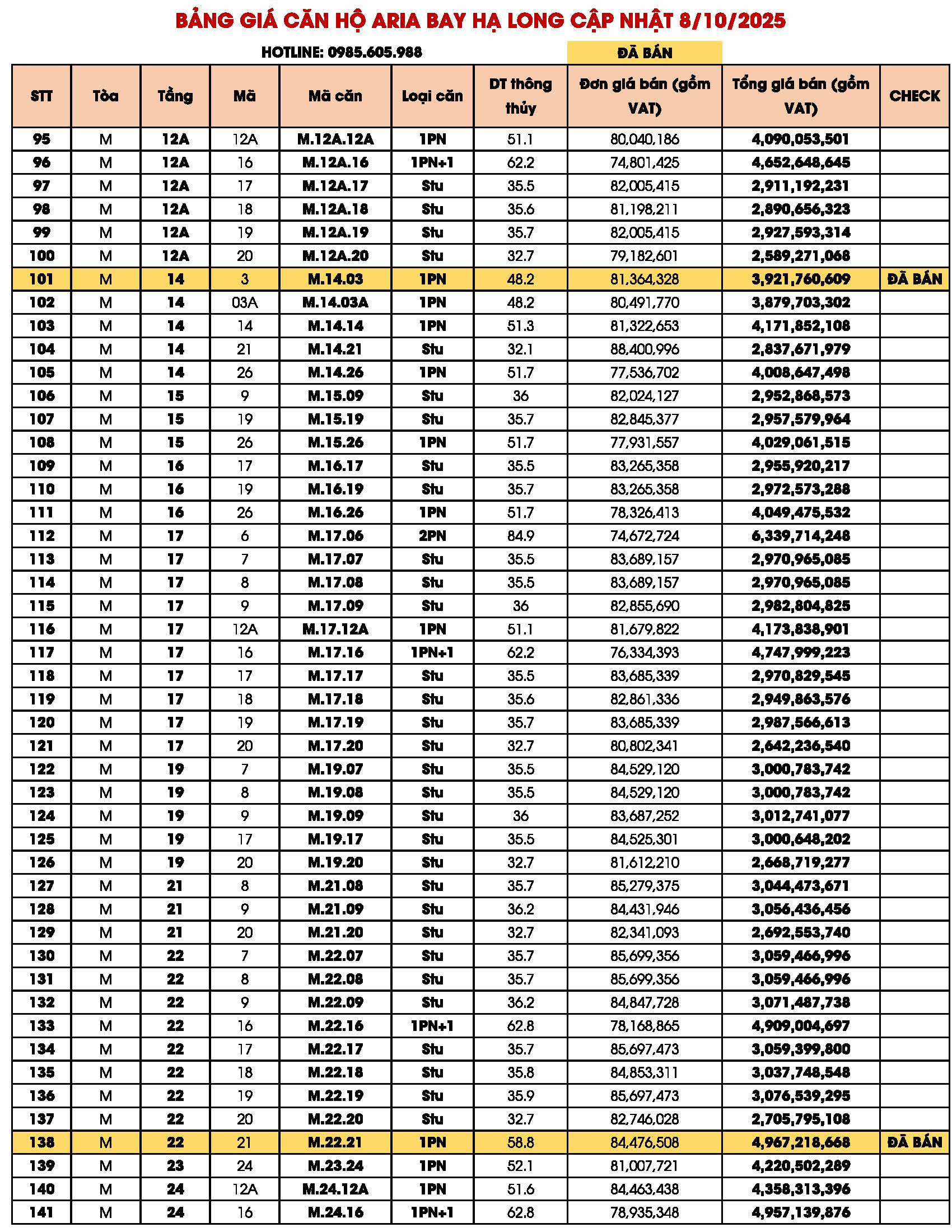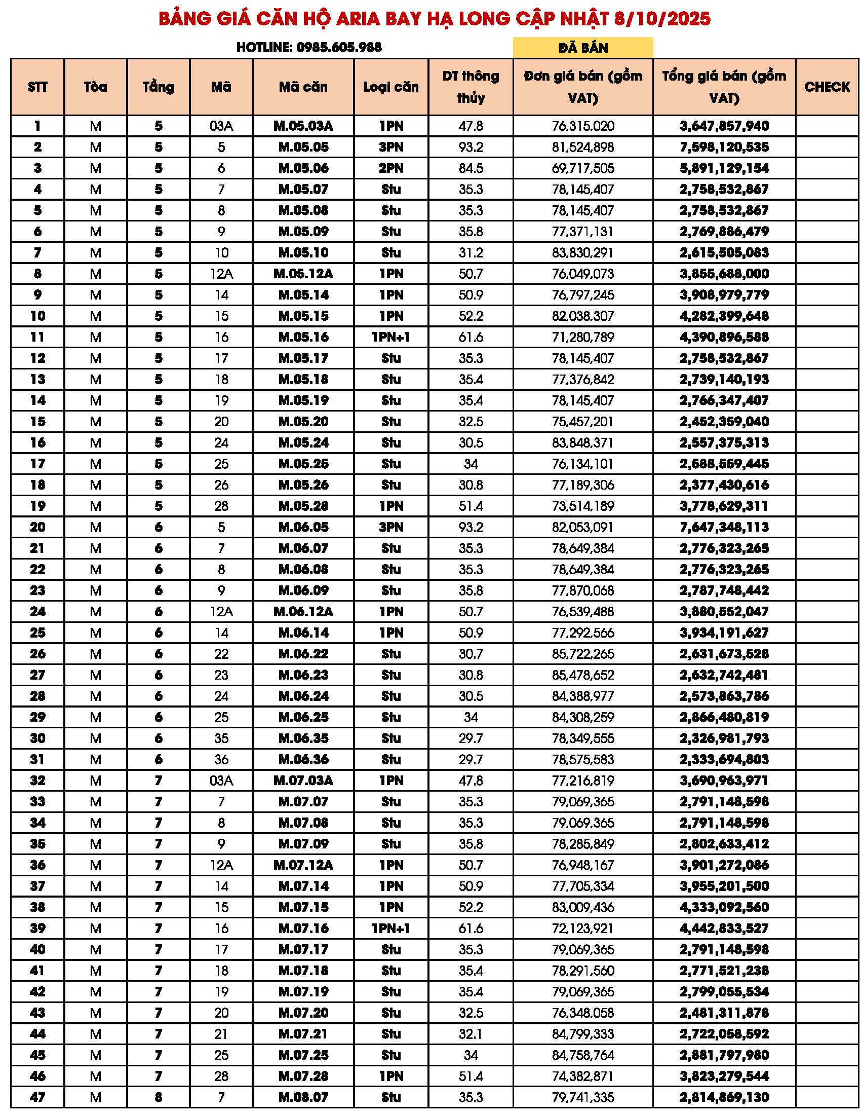 BẢNG GIÁ CĂN HỘ ARIA BAY HẠ LONG BIM GROUP NGÀY 09/10/2025