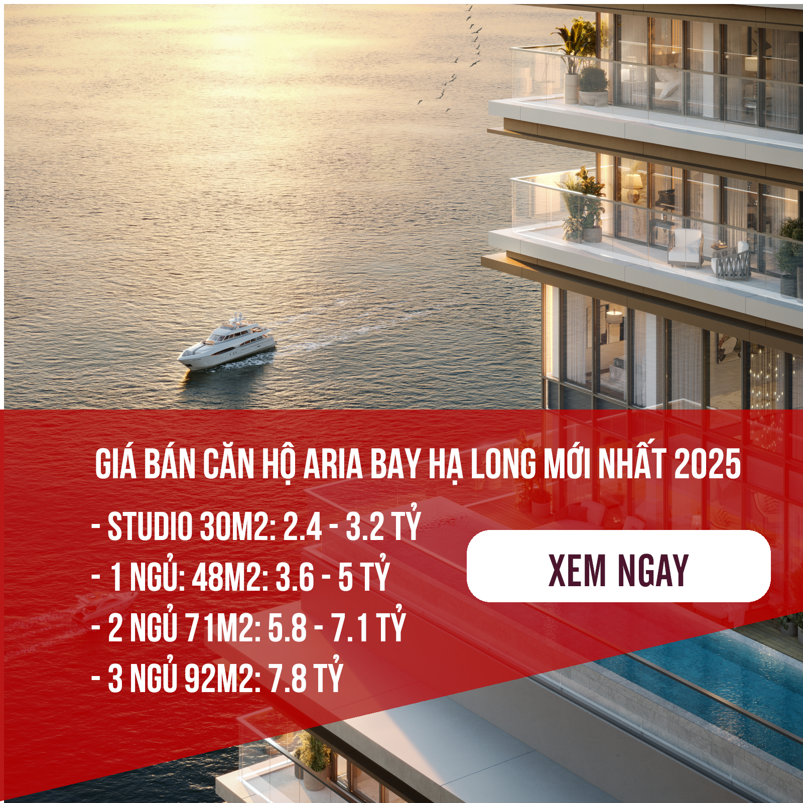 Giá bán căn hộ Aria Bay Hạ Long sẽ được chủ đầu tư niêm yết chính thức và lộ trình tăng giá theo từng giai đoạn xây dựng của dự án. Giai đoạn 1 mở bán trong tháng 10/2025 với chương trình ưu đãi dành cho khách hàng đăng ký nguyện vọng đặt mua sớm. Đơn giá bán căn hộ Aria Bay: 73 triệu/m2 -90 triệu/m2 tuỳ loại căn, tầng, hường view. Tổng giá bán căn hộ STUDIO tại Aria Bay Bãi Cháy: 2.4 tỷ – 3.5 tỷ/căn.