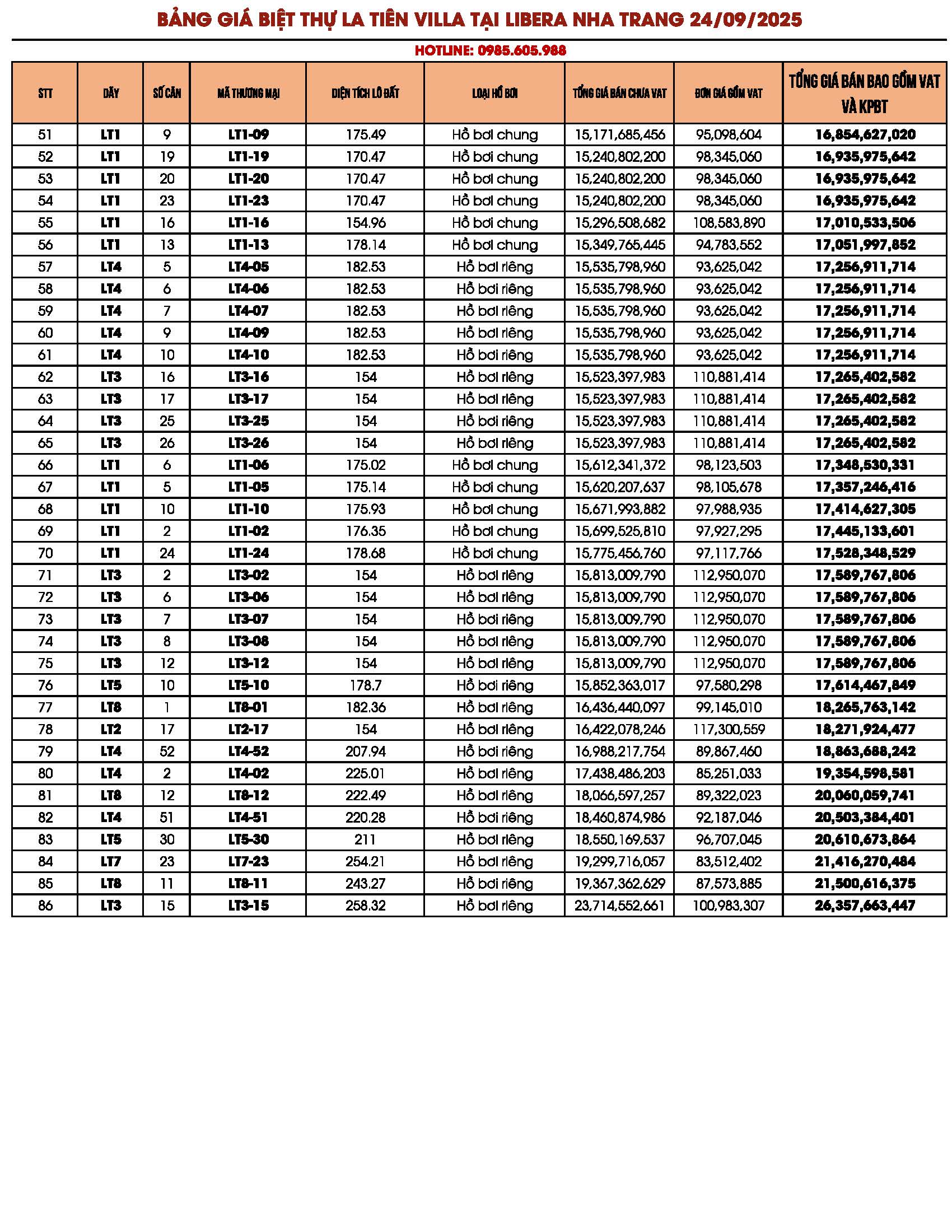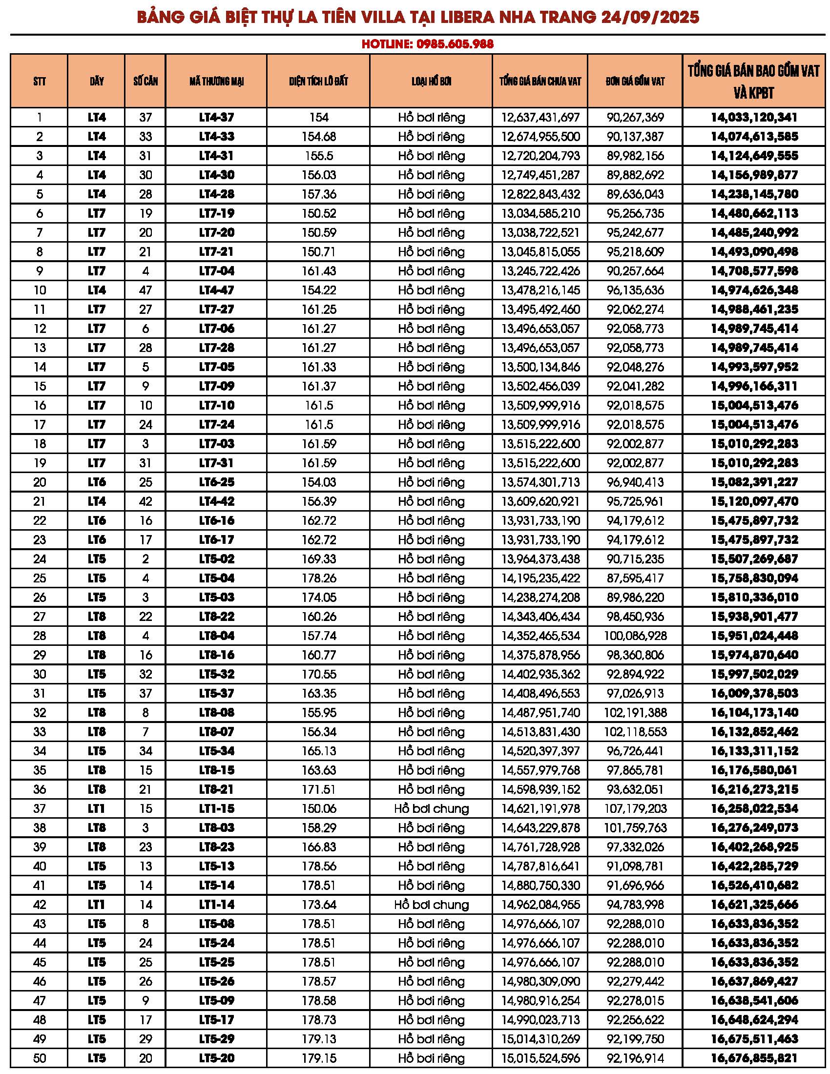 BẢNG GIÁ BIỆT THỰ LA TIÊN VILLA TẠI LIBERA NHA TRANG 2025