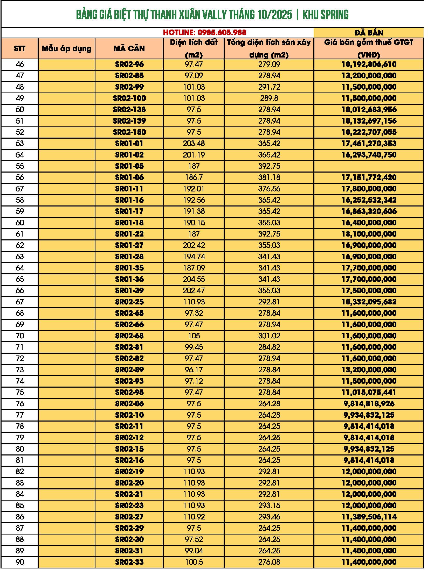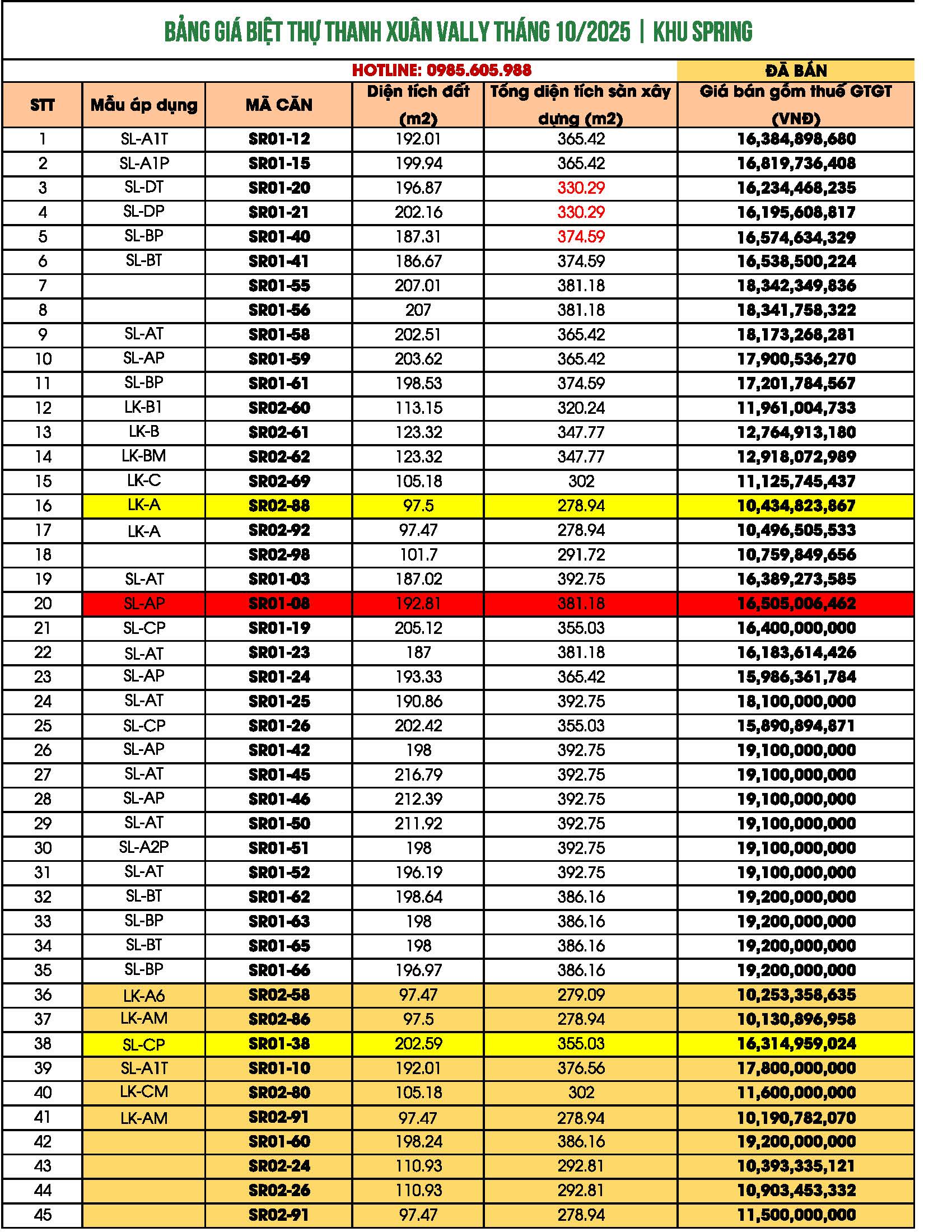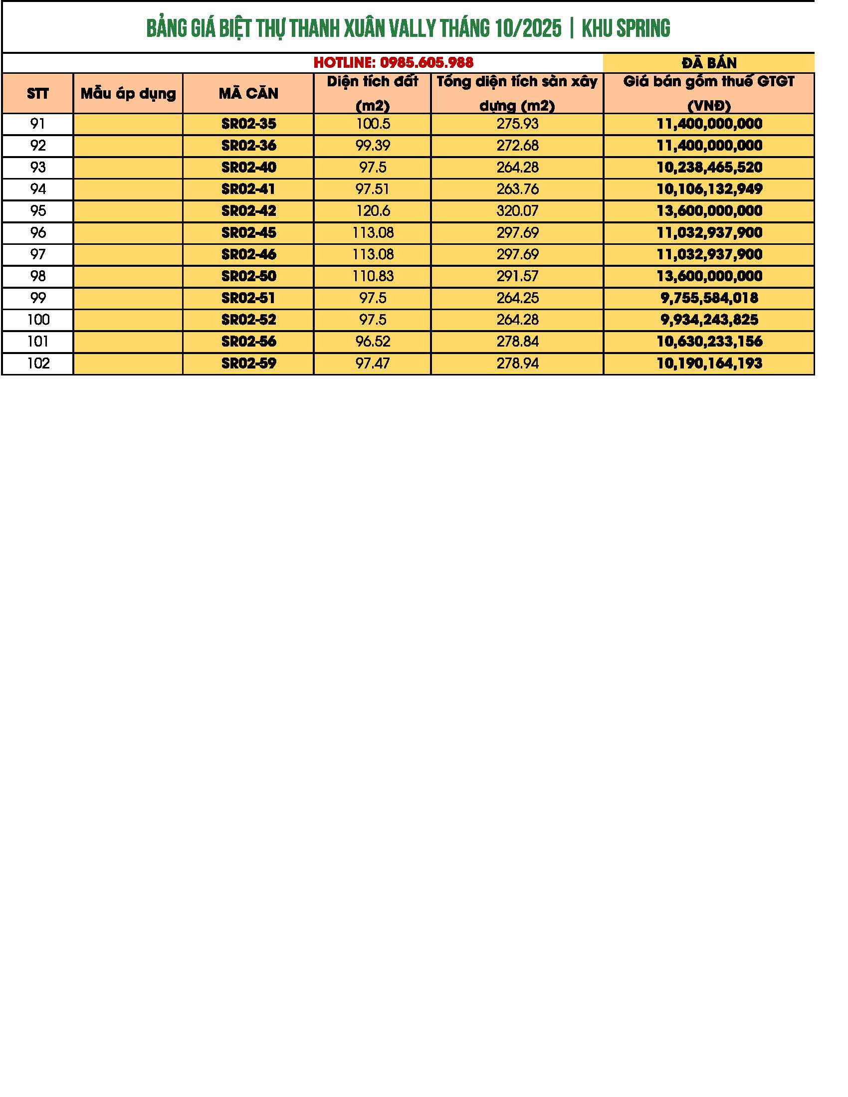Phòng KD dự án sẽ cập nhật toàn bộ bảng giá công bố chính thức của chủ đầu tư tổng số 102 căn mở bán tại PHÂN KHU BIỆT THỰ SPRING RESIDENCES thuộc dự án Thanh Xuan Valley