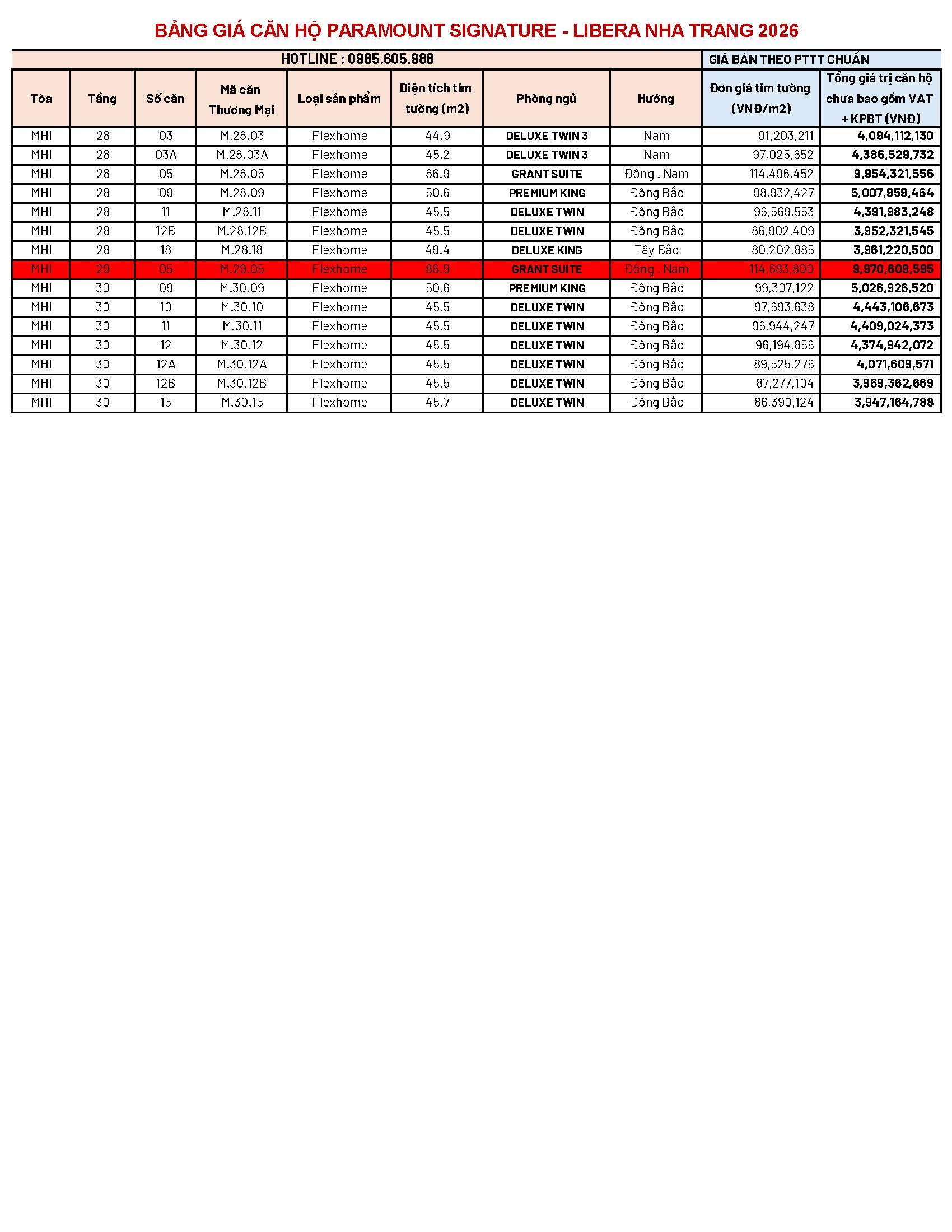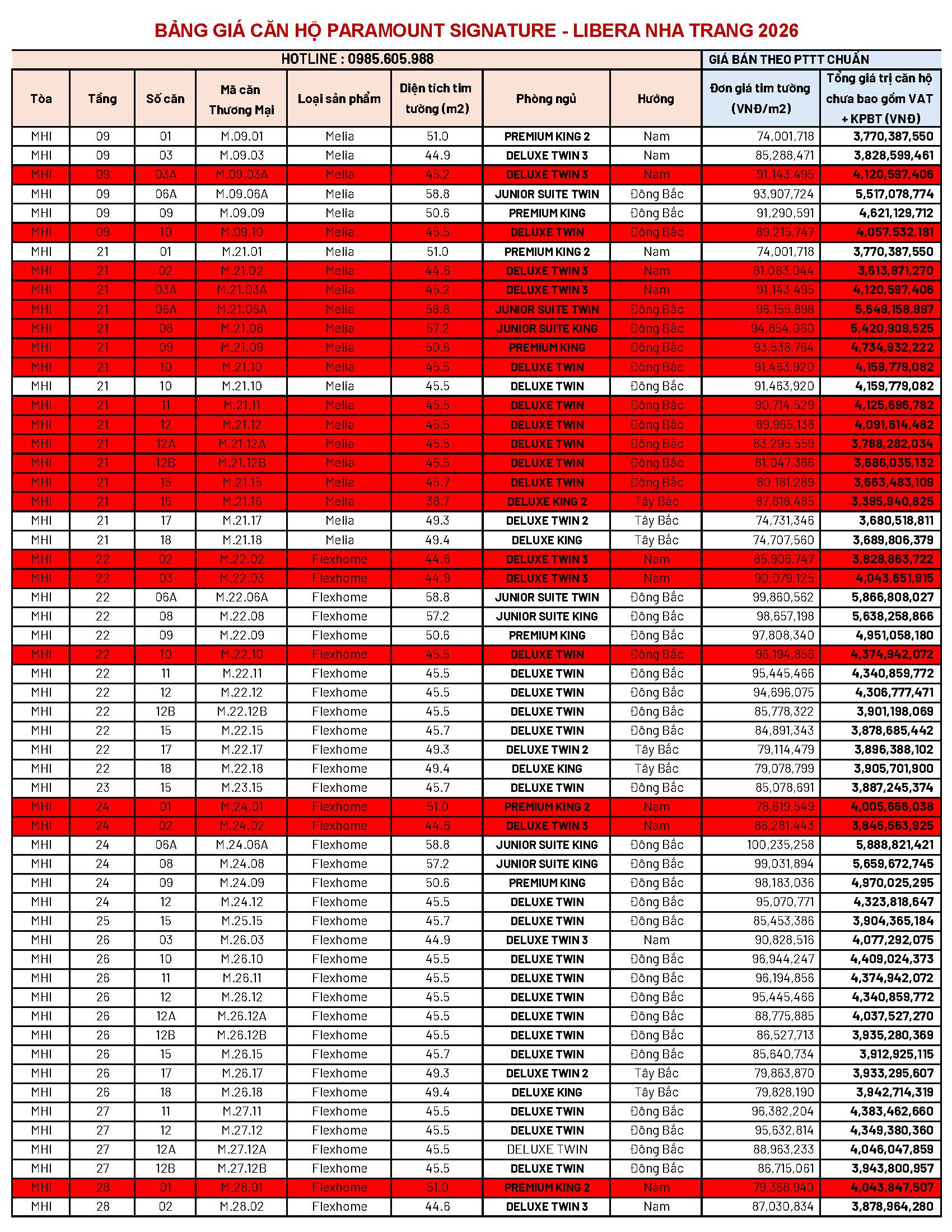 BẢNG GIÁ CĂN HỘ PARAMOUNT SIGNATURE ( MELIA NHA TRANG ) MỞ BÁN 3/2026