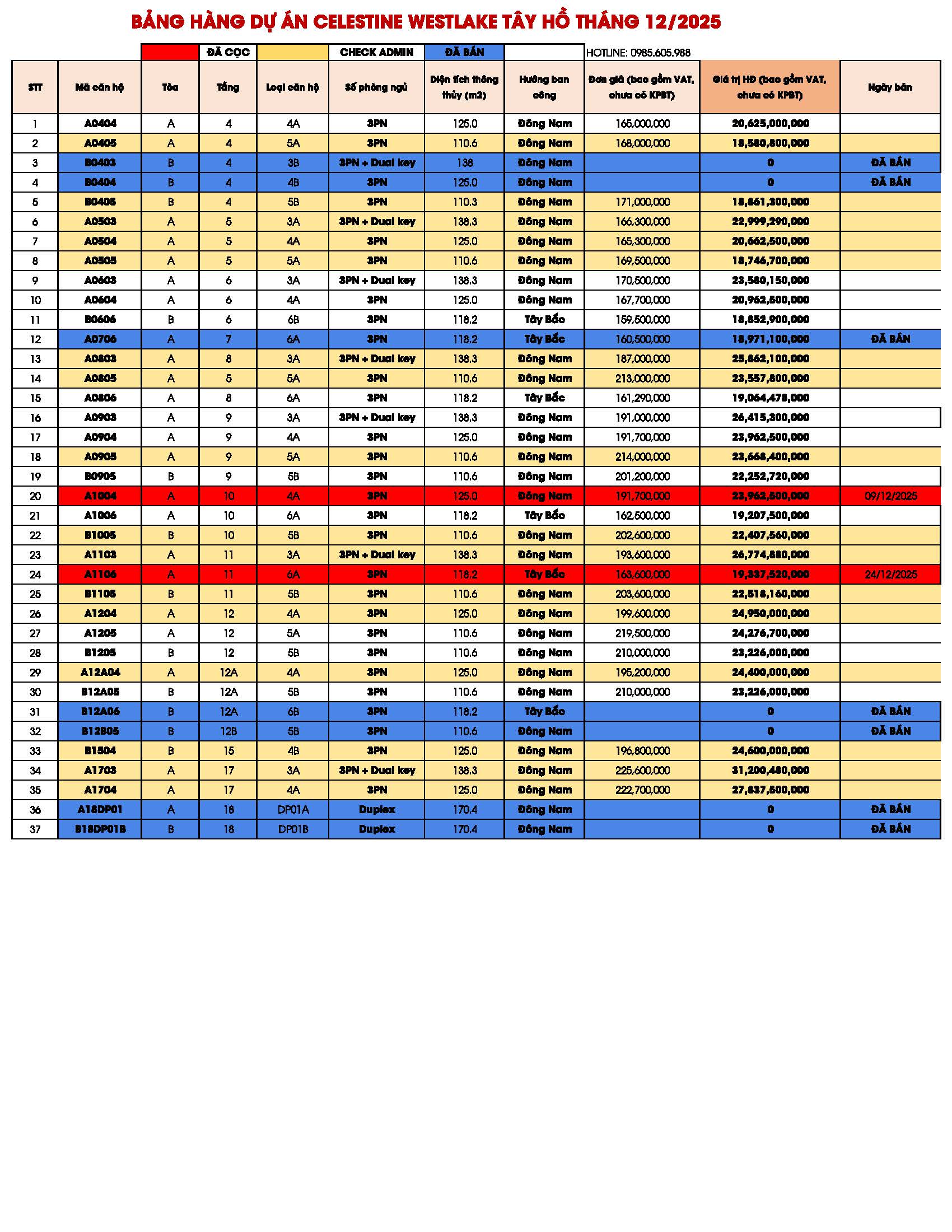 BẢNG GIÁ CĂN HỘ CHUNG CƯ CELESTINE WESTLAKE TÂY HỒ HÀ NỘI 2025