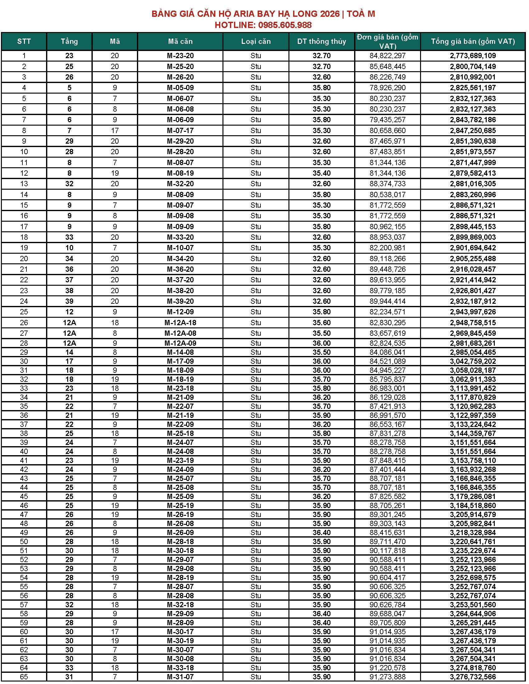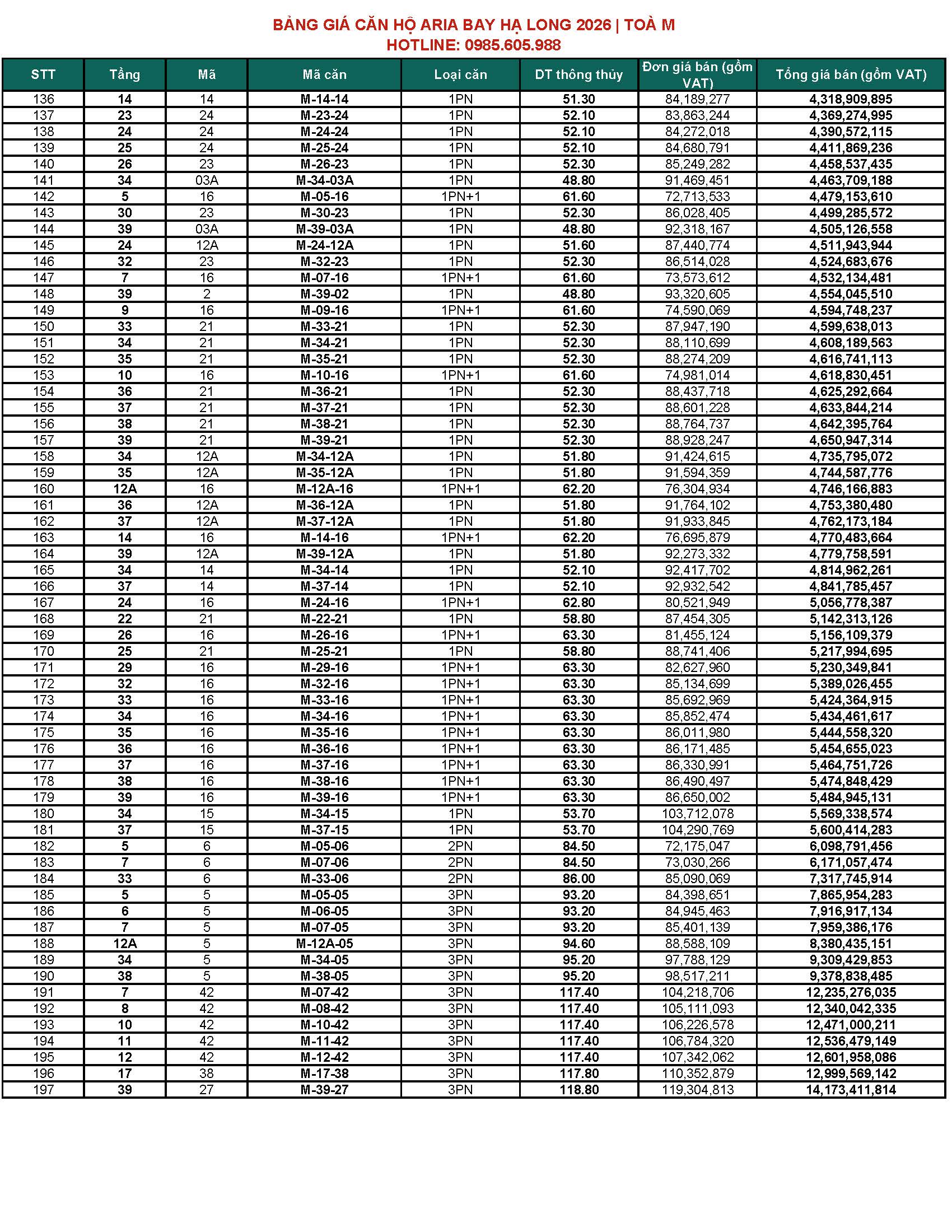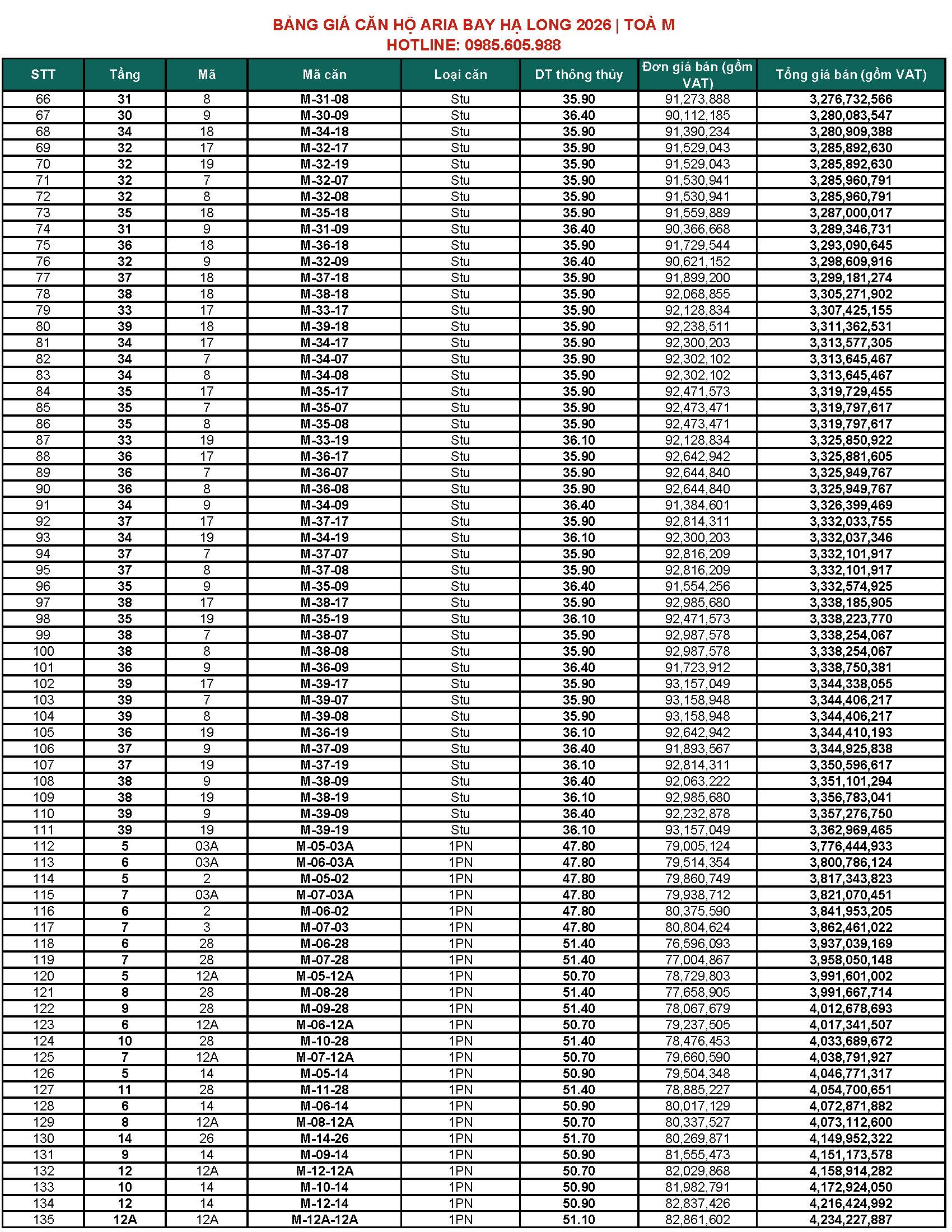 BẢNG GIÁ CĂN HỘ ARIA BAY HẠ LONG BÃI CHÁY HẠ LONG 2026 | TOÀ M & TOÀ S