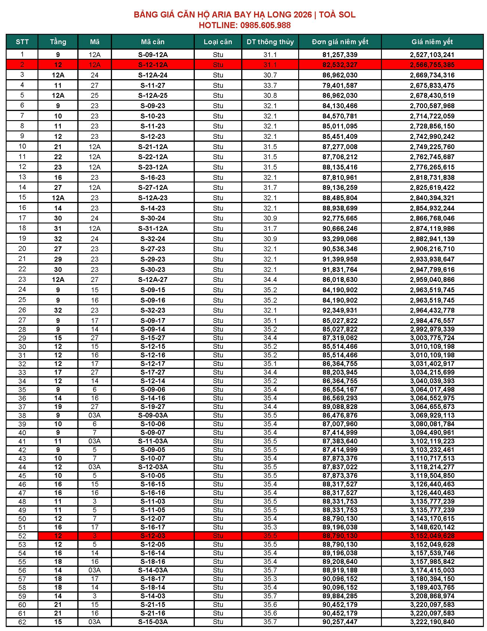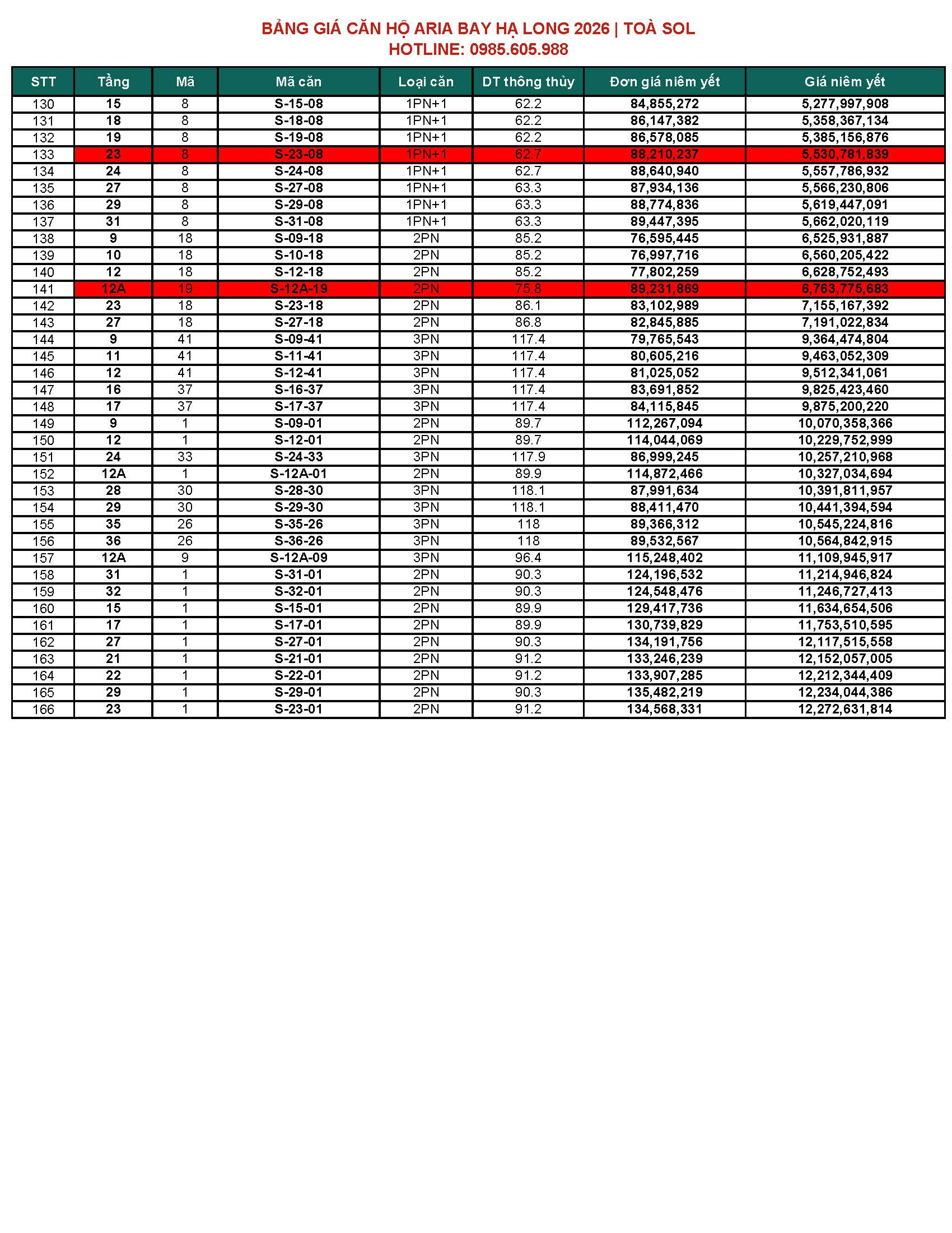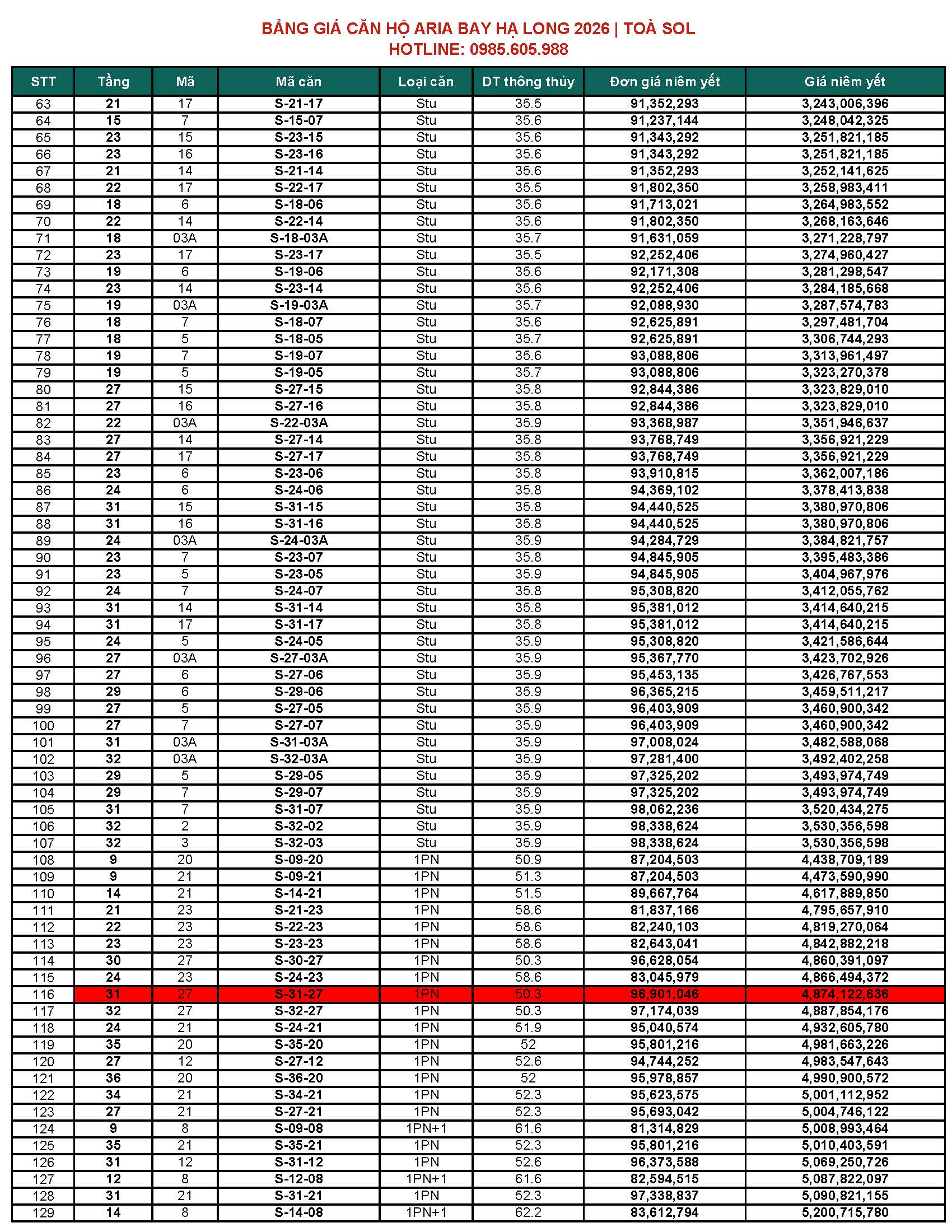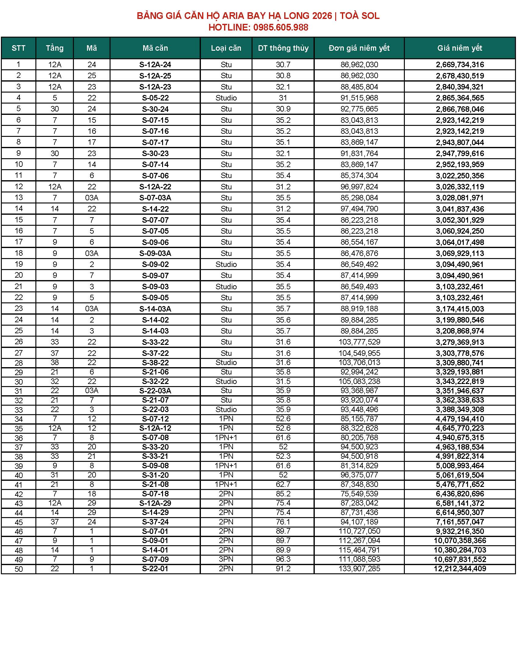 BẢNG GIÁ CĂN HỘ ARIA BAY HẠ LONG BÃI CHÁY HẠ LONG 2026 | TOÀ M & TOÀ S