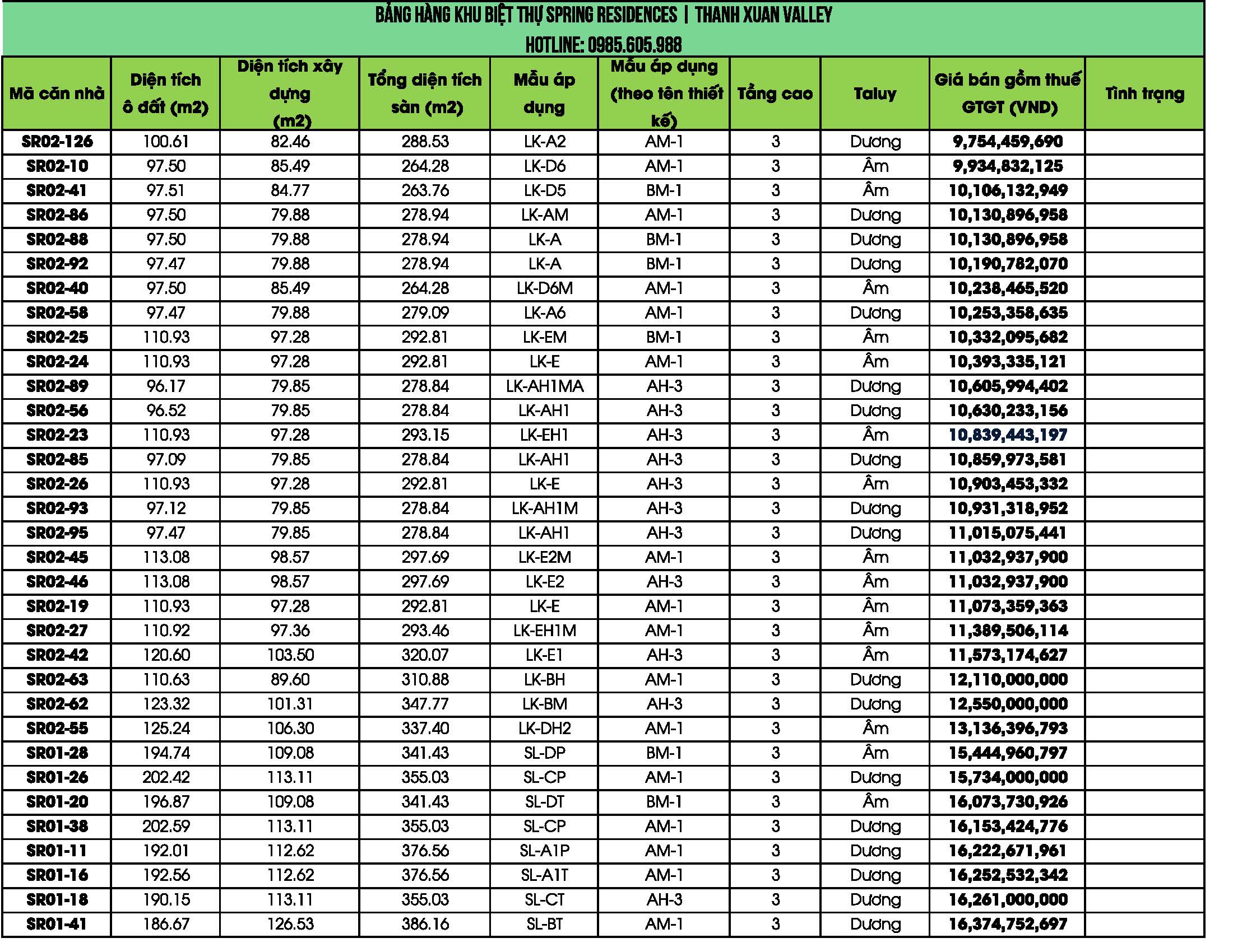 GIÁ BÁN BIỆT THỰ SPRING RESIDENCES TẠI THANH XUẠN VALLEY 2025