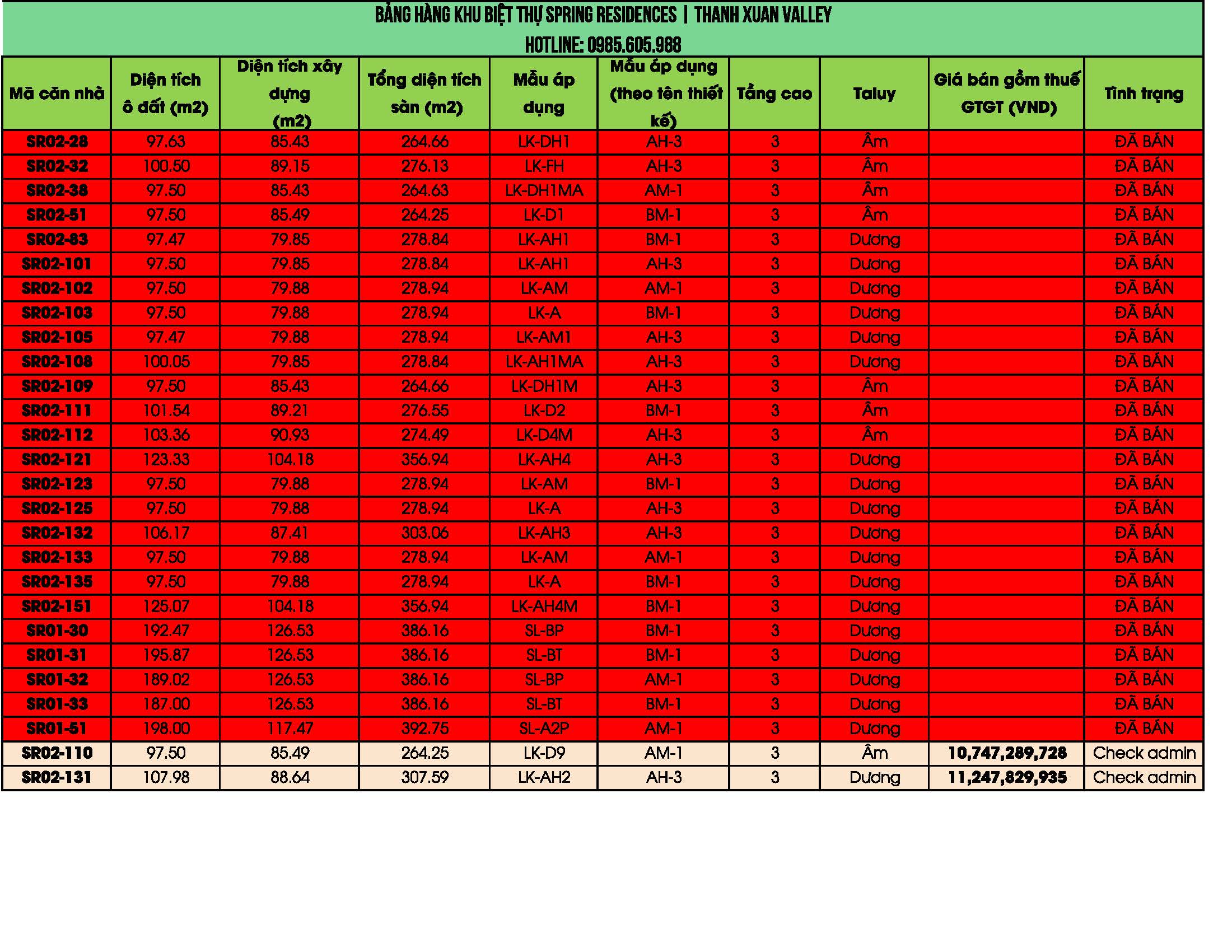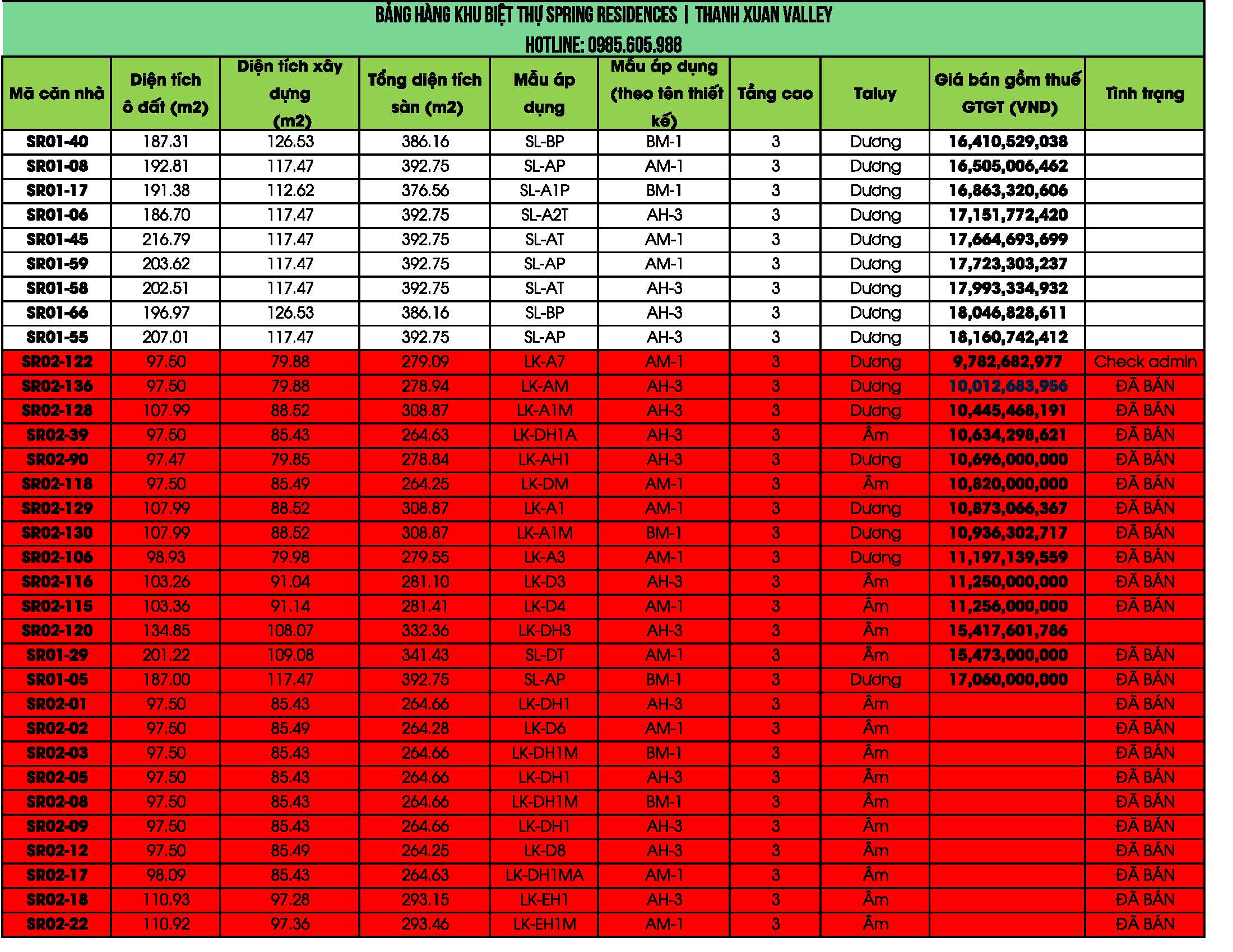 MẶT BẰNG BIỆT THỰ SPRING RESIDENCES THANH XUAN VALLEY 2025
